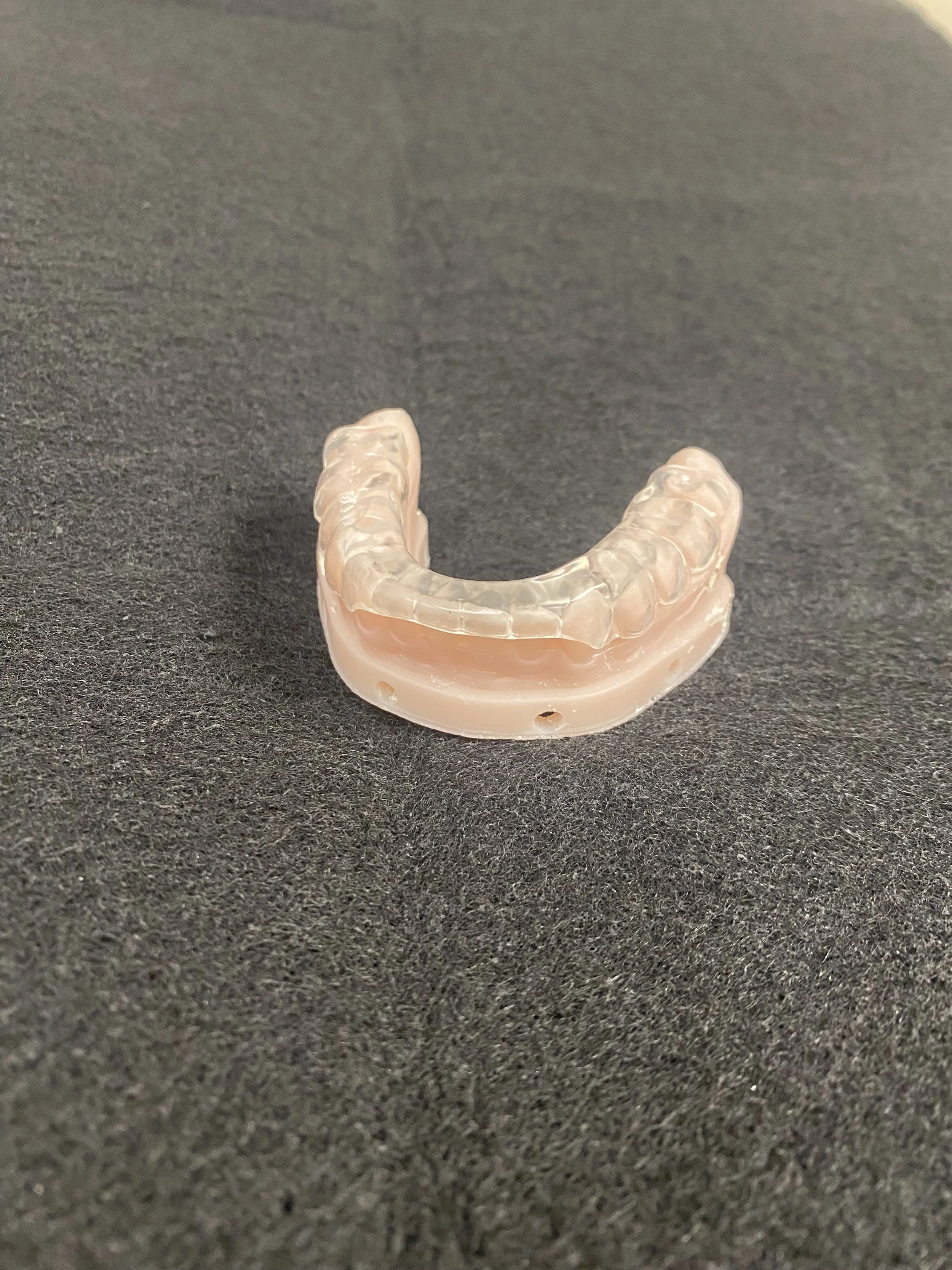 An acrylic nightguard is a type of removable dental appliance made from acrylic resin, designed to protect the teeth from grinding or clenching during sleep. It covers the biting surfaces of the teeth and acts as a cushion to absorb and distribute the forces generated by bruxism. Acrylic nightguards are custom-made to fit the patient’s teeth precisely, offering protection against wear, fractures, and other dental issues while also helping to alleviate jaw pain and discomfort.
