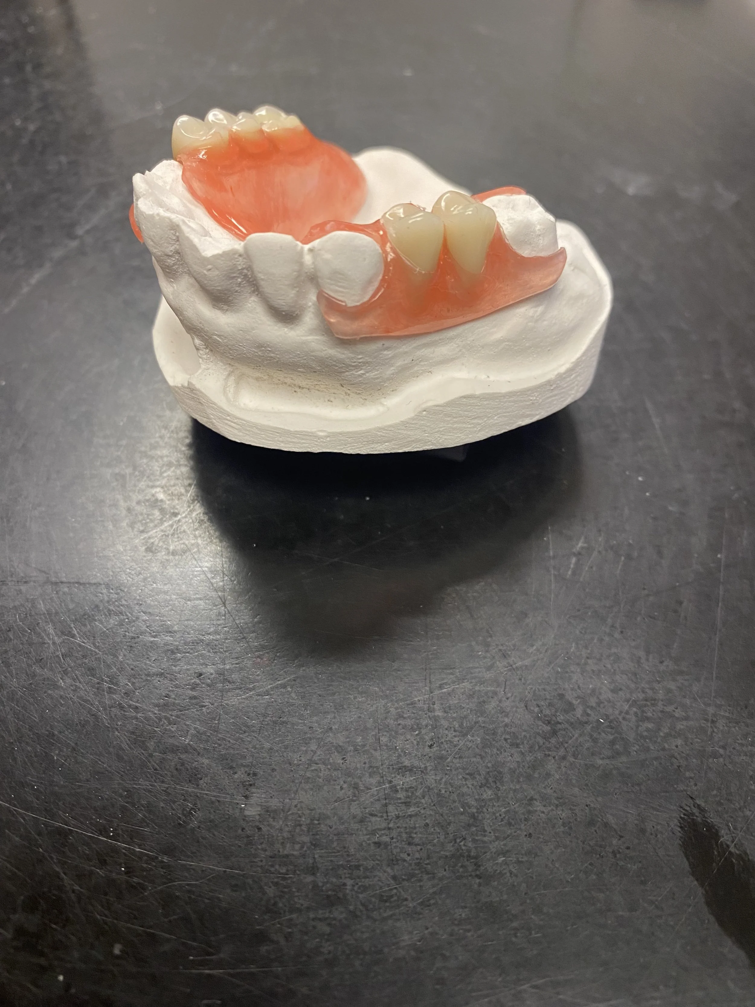 A flipper with one pontic is a removable partial denture that replaces a single missing tooth. It consists of an acrylic base that fits against the gums and includes one artificial tooth, or "pontic," to fill the gap left by the missing tooth. This type of flipper is used to restore both function and aesthetics, providing a temporary solution until a more permanent restoration, such as a bridge or implant, can be completed.